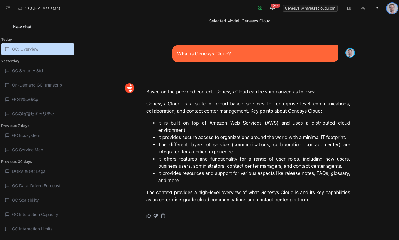 With its intuitive interface, COE AI Assistant makes it easy to access a wealth of information, including best practices, compliance standards, and actionable tips for optimizing security measures within your Genesys Cloud environment. No matter the challenge or question you may have, COE AI Assistant is equipped with the knowledge and resources to help you find the answers you need.